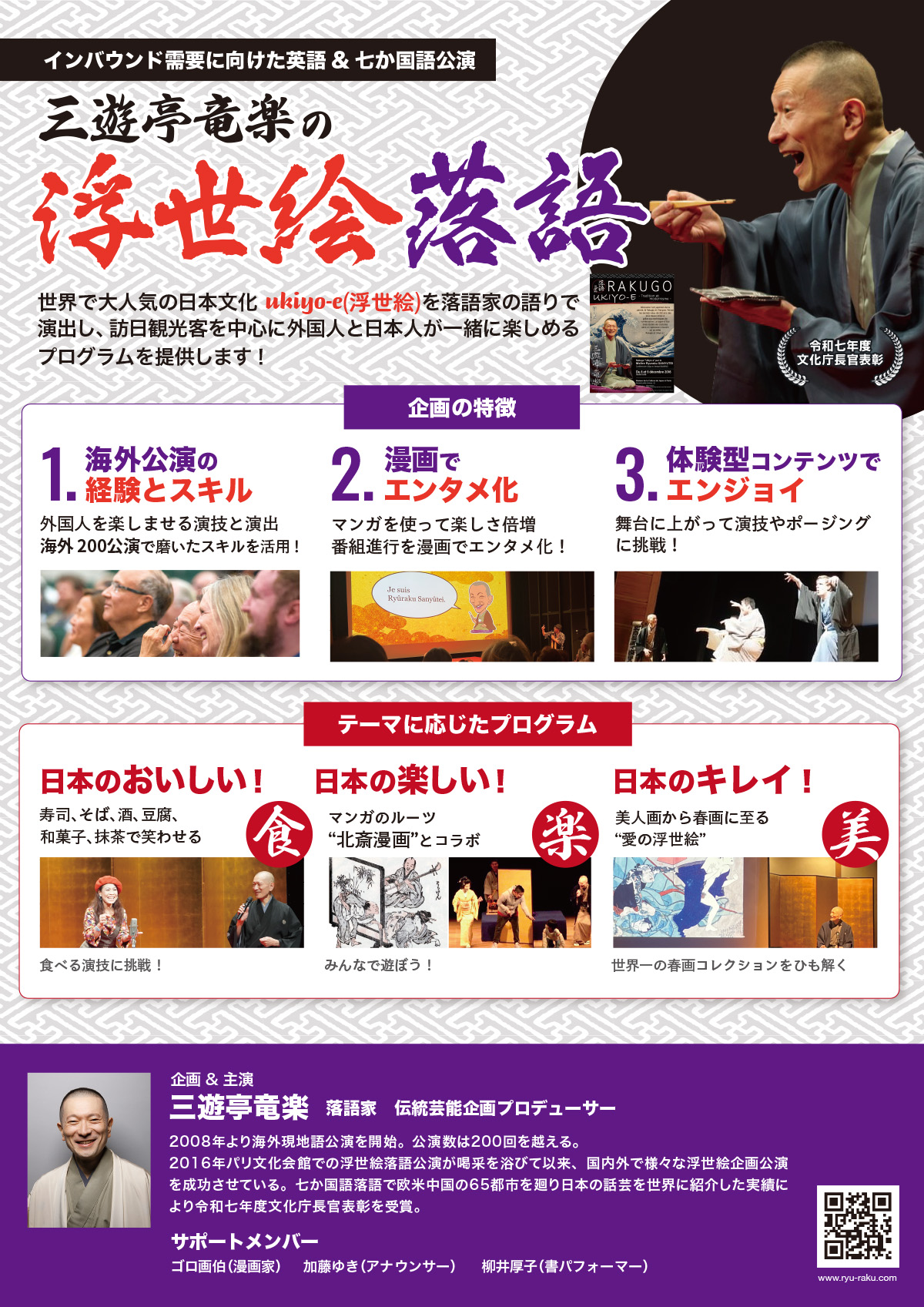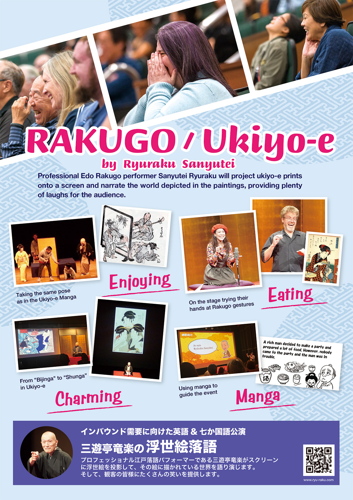2016年には、パリ日本文化会館で落語と浮世絵のコラボレーション「RAKUGO/UKIYOE・伝統と現代の出会い」を開催し好評を博す。グローバルな活動は、WOWOWの看板番組「ノンフィクションW」や 世界2億8千万世帯が受信するNHK WORLDの「Direct Talk」で特集された。